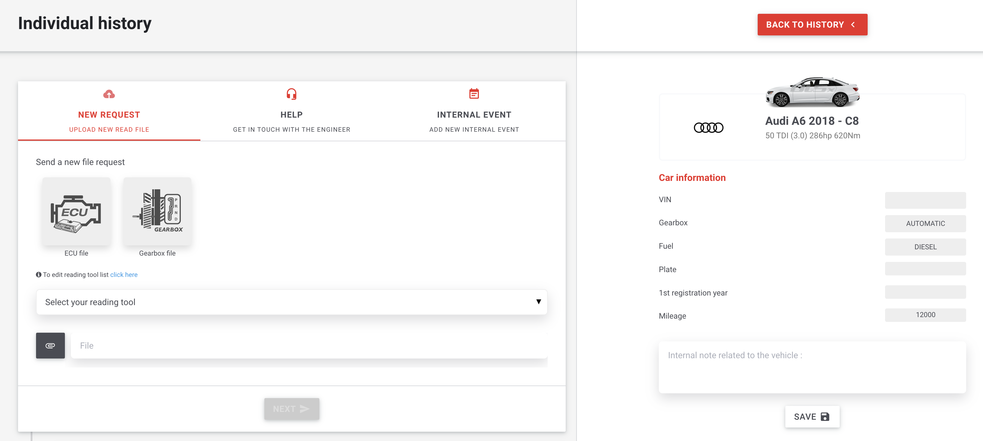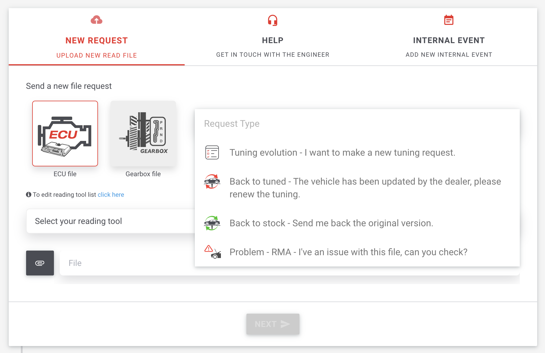 The first one allows you to send a new file (specific to this vehicle), for one of the following reasons: