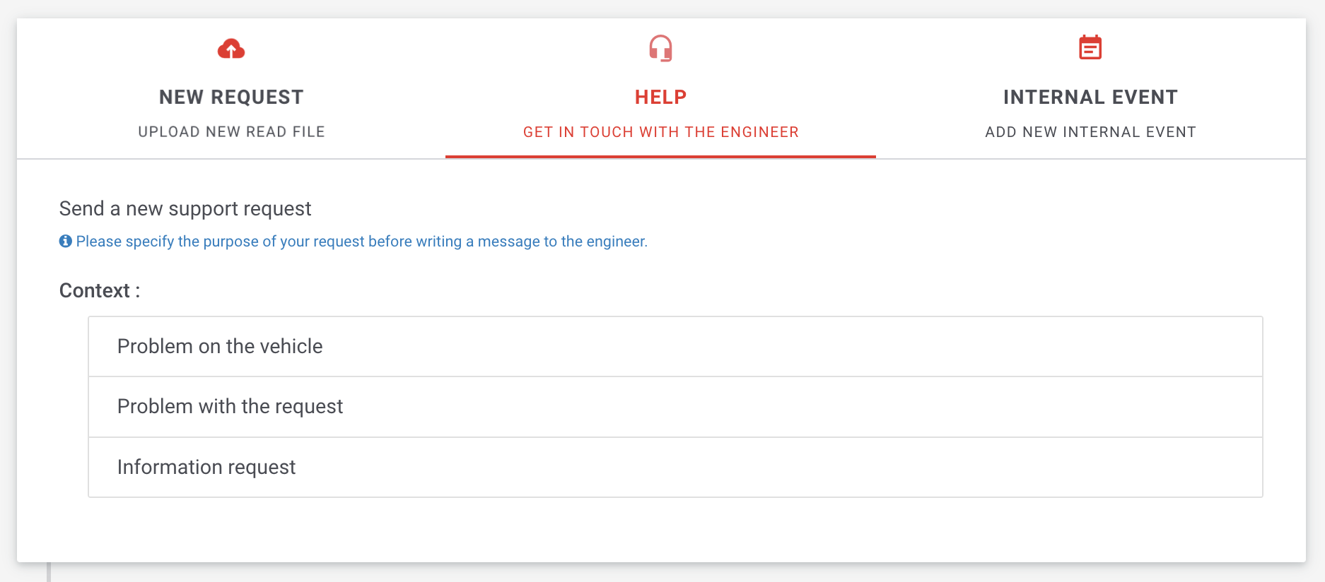The second tab allows you to contact our team in case you need help with the request. This can be a problem on the vehicle, a problem with the request itself, or a simple information you need: