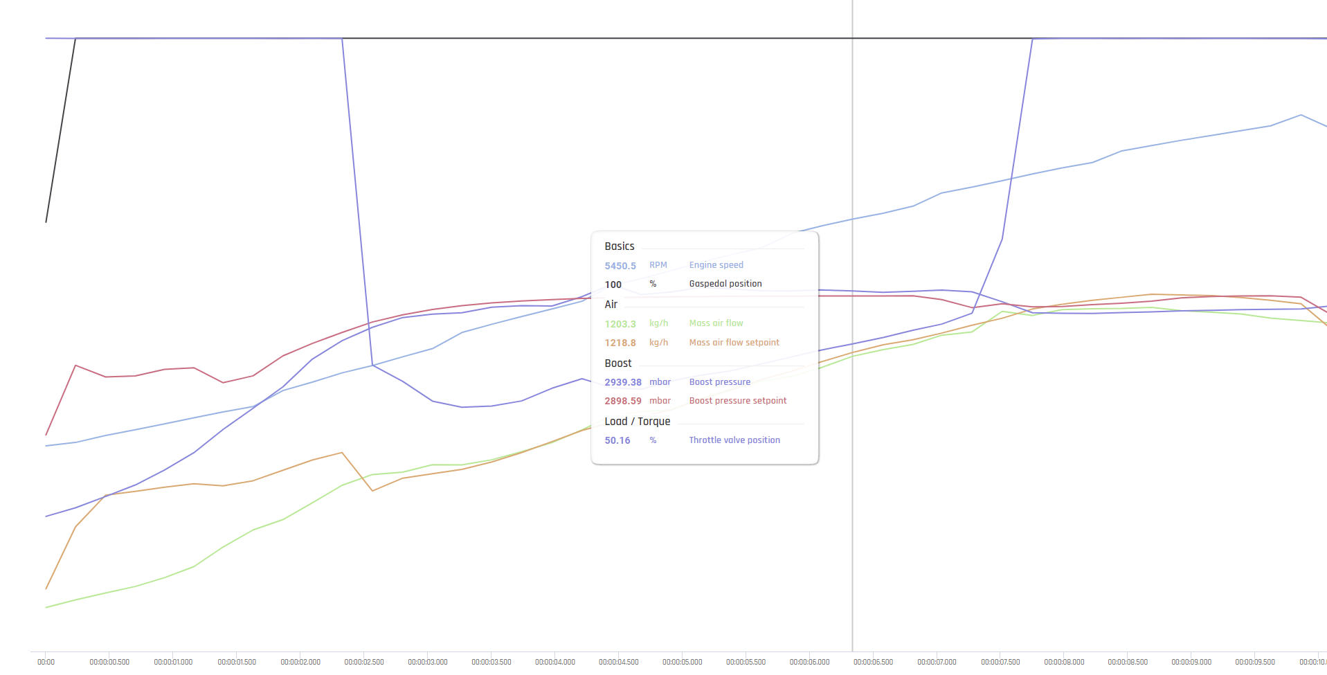 Now, after reprogramming the gearbox, we get a nicely filled curve, with the throttle wide open.